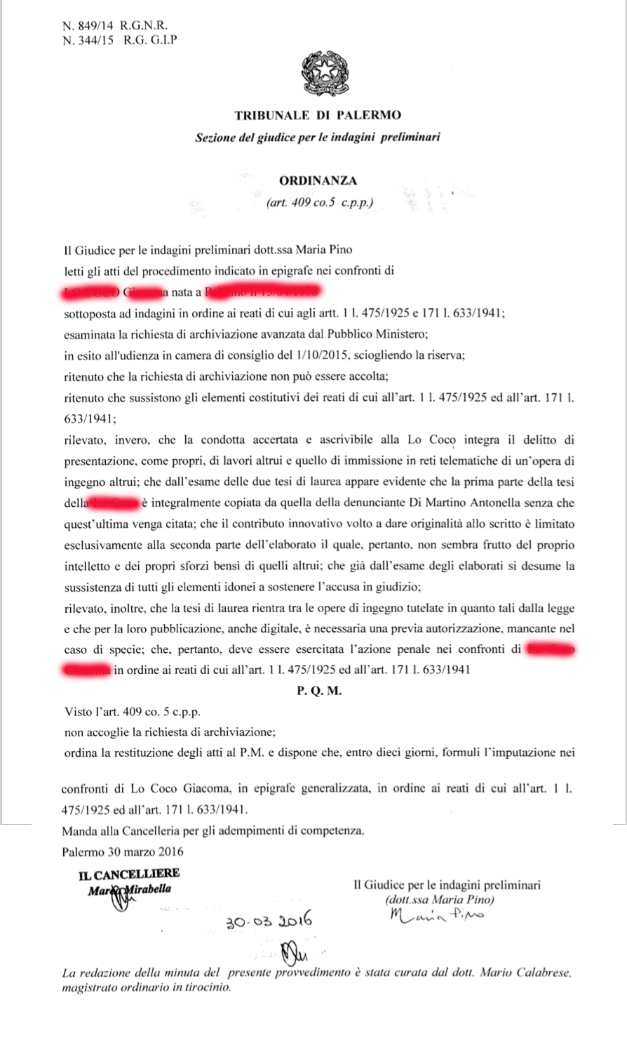 Avevo denunciato il plagio nel 2013, allegando il materiale necessario. C’era la mia tesi, con la data. C’era la copia della mia tesi, identica, pubblicata anni dopo. Che succede? Il P. M. chiede subito l’archiviazione! Ma il GIP, una persona onesta e coraggiosa, non accoglie la richiesta. Allora si va in giudizio... ma il PM, quando si avvicina il termine ultimo utile per la prescrizione, cita la parte civile sofferente di una malattia cronica e la costringe a sobbarcarsi l’onere del viaggio, per presentarsi in tribunale.