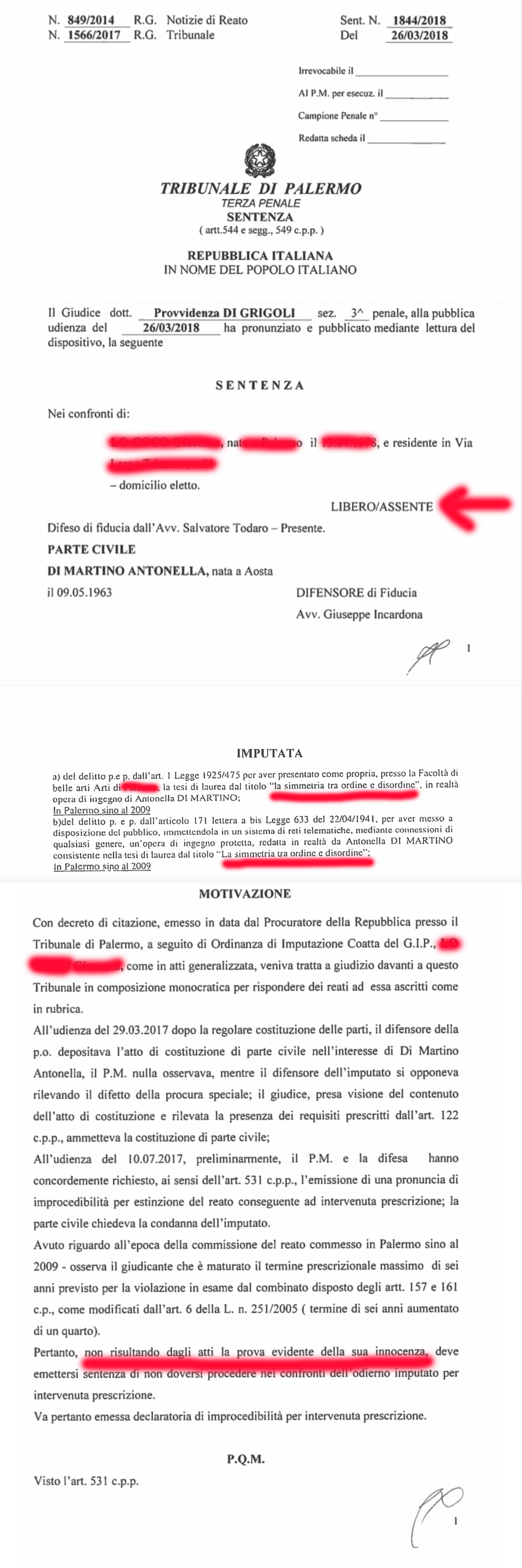 Dopo mesi di attesa, è arrivata la sentenza: il plagio della mia tesi pubblicata online, intitolata LA SIMMETRIA TRA ORDINE E DISORDINE, è prescritto. Punto. Ma il titolo della mia tesi è ancora nel sito personale di chi l’ha copiata, online, visibile a tutti. Sì, in Italia si può copiare pari pari una tesi, usarla per laurearsi con il massimo dei voti e infine pubblicarla online, rivendicandone la paternità... e poi farla franca, grazie alla prescrizione.